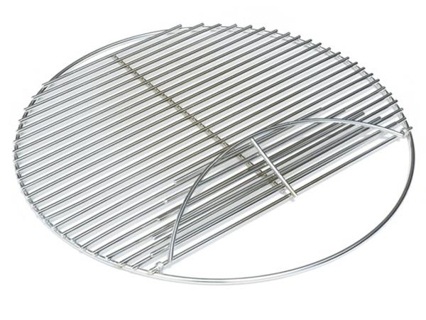The traditional stainless steel grate is made with fine rods to allow more radiant heat through for charcoal grilling. This is the 18" diameter cooking grate which is made from 304-grade stainless steel for durability; it can withstand high temperatures of up to 1000 degrees. However I recommend that you removed them from your Kamado Joe when doing any high temperature cleaning or it can inhibit rust on your grates. This cooking grate also comes with a hinge section which can be used to add wood chunks for smoking.